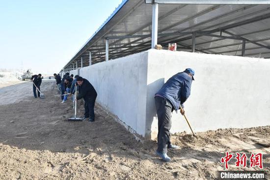五十一团唐驿镇二连群众正忙着整理新盖好的集中养殖小区路面。 塔依尔·艾力 摄