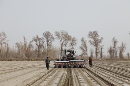 3月27日,在第一师十四团棉田里,播种机来回穿梭作业,高效完成地膜铺设、滴灌带布设及精量播种等工序,几名职工紧随机具,仔细查看下种、铺膜、覆土等环节作业质量。