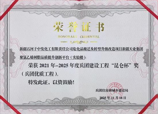 近日,兵团住房和城乡建设局公布2021年-2025年度兵团建设工程“昆仑杯”奖(兵团优质工程)名单,由石河子城投集团泰安建筑公司承建的“新疆天业集团聚氯乙烯树脂品质提升创新平台(实验楼)”项目获奖。
