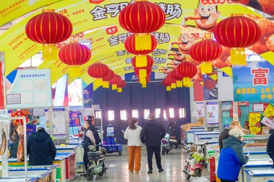 走进九鼎市场冻品交易区,红灯笼、中国结与生肖装饰将市场装点得年味十足。各类腊味、干果、糖果及礼盒商品摆放有序,部分商户巧妙利用腊肠、干辣椒等食材进行场景化陈列,既突出商品特色,也烘托出浓厚的节日氛围。