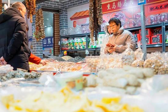 商户霍新伟说:“快过年了,很多消费者会来我们摊位挑选具有乡村特色的农副产品,比如四川腊肉,还有各种适合煲汤的山货。”