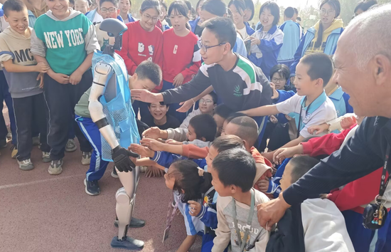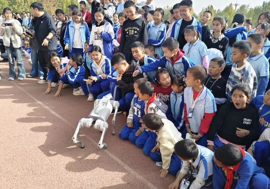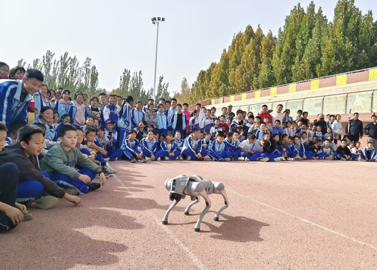 这是机器人、机器狗首次走进三团中学校园,机械狗表演、人形机器人表演、九人行机器人方队队列表演,赢得了孩子们阵阵掌声。看过展示后学生们激动不已,啧啧称赞,“我和机器人握手了”“机器人太神奇了”“机器人太酷了”。