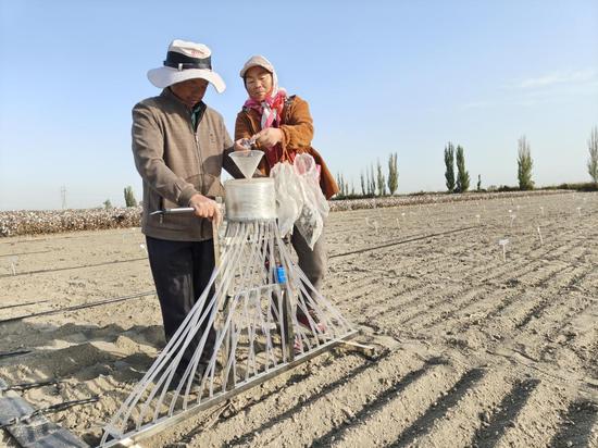 近日,走进新疆生产建设兵团第一师农业科学研究所的育种田,工人利用改造的机器进行人工点种,开启种质培育工作。