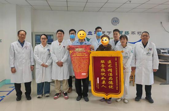 术后,覃新国的胸闷、气促等症状有效缓解,生命体征逐步平稳。在医护人员的精心照护下,他的身体一天天恢复。出院前夕,覃新国和老伴将一面锦旗及一封感谢信,郑重交到普外科二病区医护人员手中。信中写道:“是你们毫不犹豫的救治、专业精湛的医术和亲切温暖的笑容,把我从绝望的边缘拉了回来。谢谢你们给了我第二次相守的机会。”