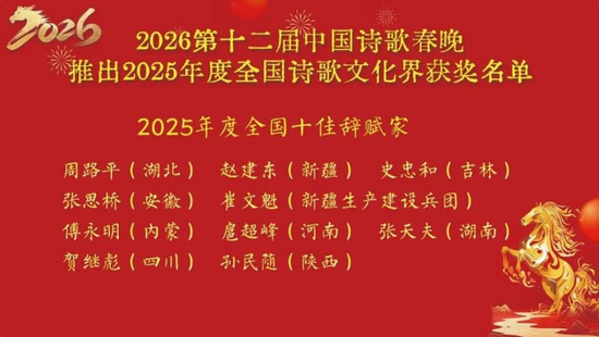 2月9日,2026年第十二届中国诗歌春晚总会场公布2025年度全国诗歌文化界获奖名单,兵团辞赋家崔文魁获评“全国十佳辞赋家”,成为兵团首位获此殊荣的辞赋创作者。