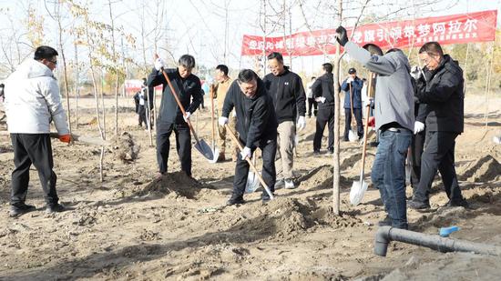 在植树地块,大家分工协作、相互配合,挥锹铲土、整坑施肥、踩实压紧,齐心协力栽种下一株株红叶杨、沙枣、杜梨、密胡杨等耐盐碱、耐旱树苗,经过一番辛勤劳作,6500余棵新苗扎根沃土、排排挺立,使超10万平方米的荒地换新颜,进一步筑牢绿色屏障。