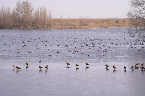 冬日,在新疆生产建设兵团第十四师二二五团,包括灰鹤、赤麻鸭、白鹭、绿头野鸭等在内的10余种、万余只珍稀鸟类在此栖息。