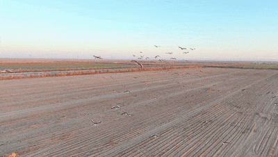 循声望去,一群灰鹤正缓缓降落。它们扇动着宽大的翅膀,修长的双腿轻盈触地,随即低下头,用细长的喙啄食田间的豆粒。