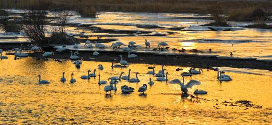 “它们是记得我们的。”葛玉杰感叹道。每年深秋,第一批抵达的天鹅总会先在湾域上空盘旋几圈,发出嘹亮的鸣叫,仿佛在向老朋友们打招呼。如今,来这里越冬的大天鹅已有百余只,同来的还有赤麻鸭、绿头鸭、鸬鹚等多种鸟类。