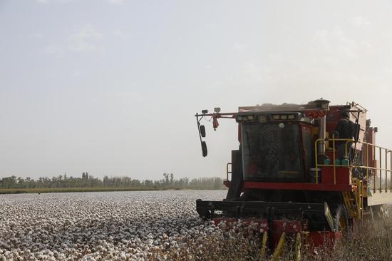 中新网兵团新闻10月11电(朱克峰 蒋慧芹 牛俊鑫)金秋十月,正值棉花采收的关键时期。10月11日,在新疆生产建设兵团第一师十四团一连职工张春生的棉花地里,雪白的棉朵竞相绽放,采棉机正开足马力在广袤的棉田里来回穿梭,呈现出一派繁忙的丰收景象。