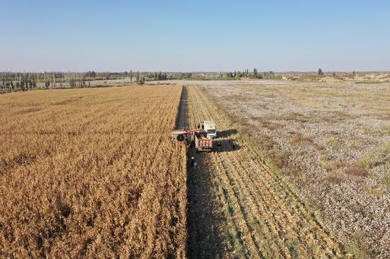 据了解,五十三团金胡杨镇今年6000多亩套种玉米,初步测产平均亩产800公斤。目前收割已全面启动,预计10月底前就能完成全部采收。(阿孜古力·艾沙 阿孜姑·吾布 张蕾)