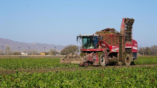 何陆春说:“今年一共种了300多亩地甜菜,全部采用机械化收割,省时又省力。年头就跟糖厂签的订单,收完以后就直接交到糖厂,效益还可以。”