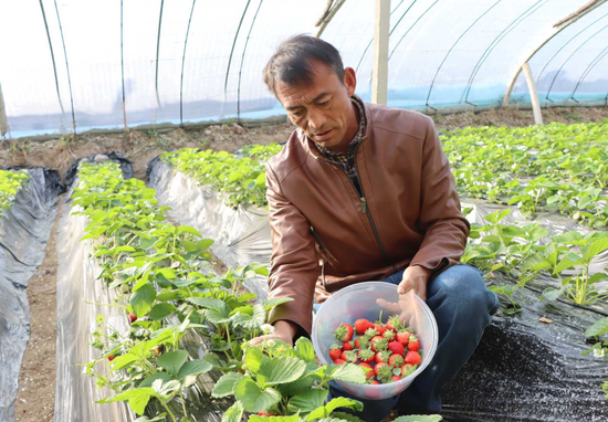 “草莓已经成熟开始销售,目前销售有两种渠道,一是供游客现场采摘,价格在120元每公斤;另外一个是向水果店、超市批发。果子又大又甜,一到周末,来采摘和订购的顾客特别多。我的这1个棚占地2亩,按照目前的市场价格,今年收入5万元左右是没问题的。”种植户付金生笑着说。