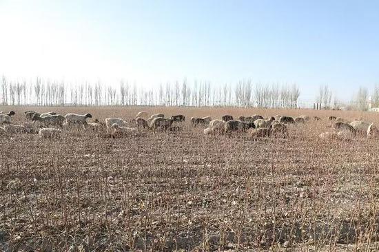 棉花采收结束后,新疆生产建设兵团第三师五十三团金胡杨镇的棉田里迎来特殊“客人”——成群结队的羊只悠闲觅食,将往日废弃的棉秆变为越冬“主食”。