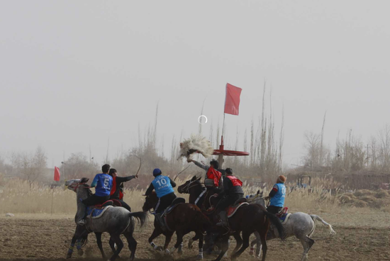 比赛现场,黄沙漫天,呐喊助威声此起彼伏。来自和田地区和昆玉市的6支代表队100多名骑手轮番上场,他们身着民族盛装,跨上骏马,如同离弦之箭般在沙漠中疾驰。骑手们在马背上施展各种精湛技巧,时而俯身疾冲,时而翻身抢夺,比勇敢、赛骑术,相互配合,奋力争抢,场面十分激烈,引得观众阵阵欢呼。