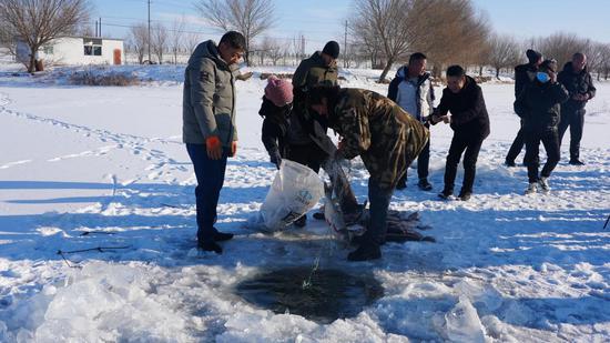 刚出水的鱼被岸边等候的市民、游客瞬间抢购一空。一六三团一连谊联特色种植养殖合作社负责人何忠良高举刚出水的“头鱼”笑得合不拢嘴。“冬捕‘首秀’比预期火爆。”