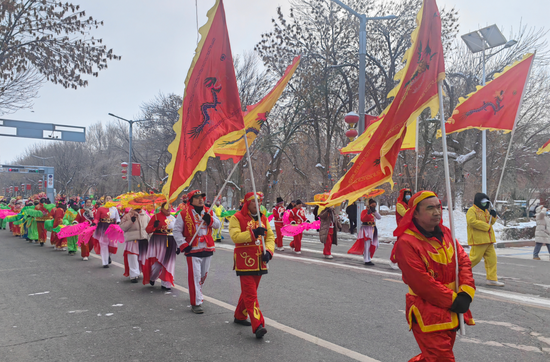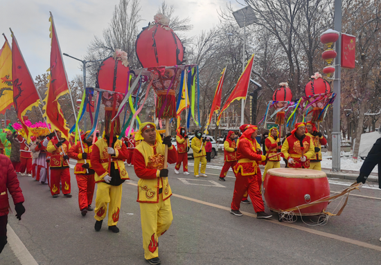 社火送祝福巡游展演活动是团场职工群众最关注的焦点。在街道两旁早已聚满了等待观看表演的人群。社火表演队伍沿着团场主要街道进行巡游表演。欢快的秧歌扭出幸福生活,激昂的腰鼓敲出美好期盼,传统社火的热闹与马年奋进的朝气交相辉映,街道上沉浸在喜庆祥和的节日氛围之中。