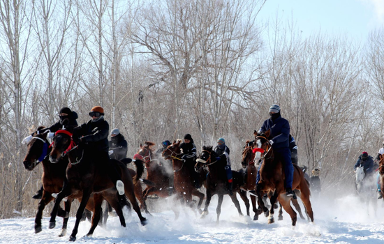 雪域驰风赛马蹄声如雷,凌空扬鞭骏马驰骋飞奔。随后展开的叼羊、赛马更将活动推向高潮,来自团场、哈巴河县乡的骑手们精神抖擞,身跨爱骑,策骏马、扬长鞭、激风尘、展特技,在赛道上展开一场激情与速度、耐力与骑术的激烈较量,骏马奔驰、白雪飞扬、喝彩雷动。(刘锦安)