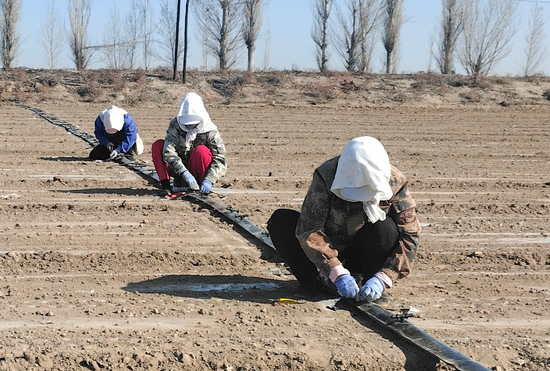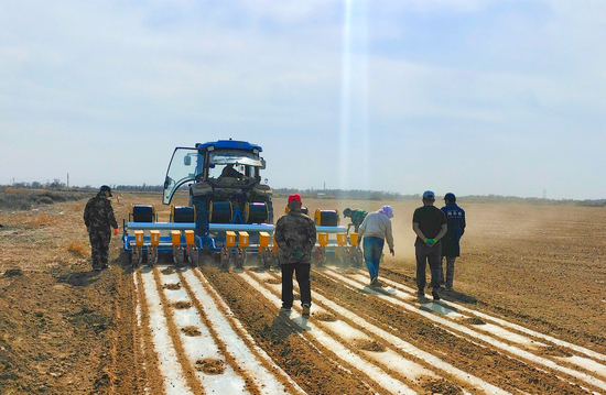 目前,一四九团17.1万亩棉花播种工作正在有条不紊的进行着,各连队抢抓农时,利用晴好天气,采取边播种、边布管,播完一块,布完一块,为棉花滴水出苗做好准备工作。